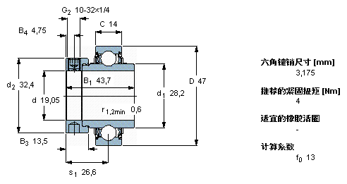 型號:YEL 204-012-2FCW 品牌:SKF 系列:用偏心鎖定環的 Y 型軸承 內徑:19.05 mm 外徑:47 mm 寬度:43.7 mm
