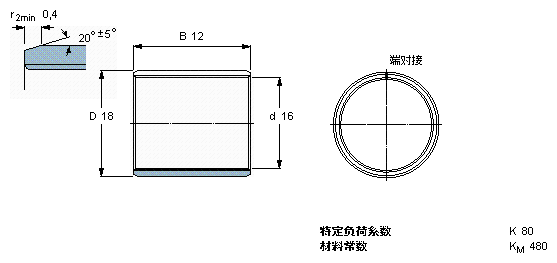 型號:PCM 161812 B 品牌:SKF 系列:公制尺寸的復合干式滑動套筒 內徑:16 mm 外徑:18 mm 寬度:12 mm