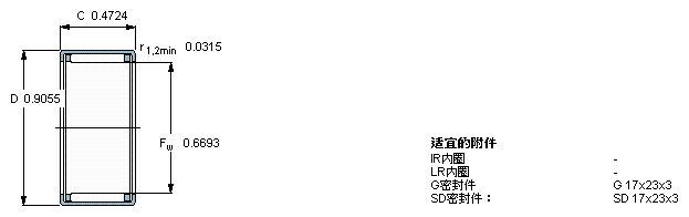 型號:HK 1712 品牌:SKF 系列:沖壓外圈滾針軸承 內徑:17 mm 外徑:23 mm 寬度:12 mm